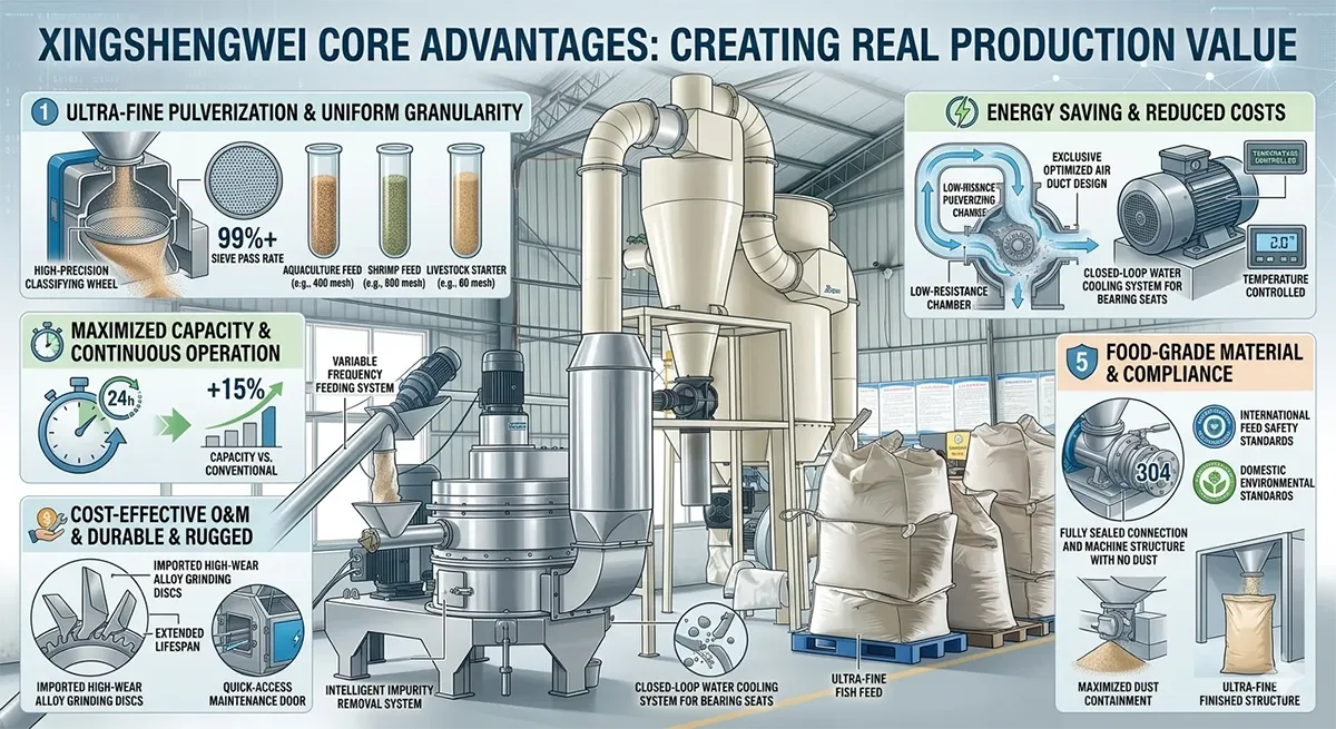 If you are engaged in the feed processing industry, you must be well aware of issues such as uneven powder particle size, high raw material loss, and frequent equipment downtime, which not only compress profit margins but also directly affect the quality of finished feed. As a leading manufacturer of powder crushing equipment for many years, Xingshengwei has been dedicated to developing the extruded feed ultrafine pulverizer, which is specifically designed to address industry pain points. The machine is finely crafted, sturdy, and durable, and is tailor-made for puffed feed production lines. It can significantly improve production efficiency and reduce full cycle operation and maintenance costs, achieving uniform and stable particle size for each batch of crushing, and helping feed factories improve quality and efficiency.